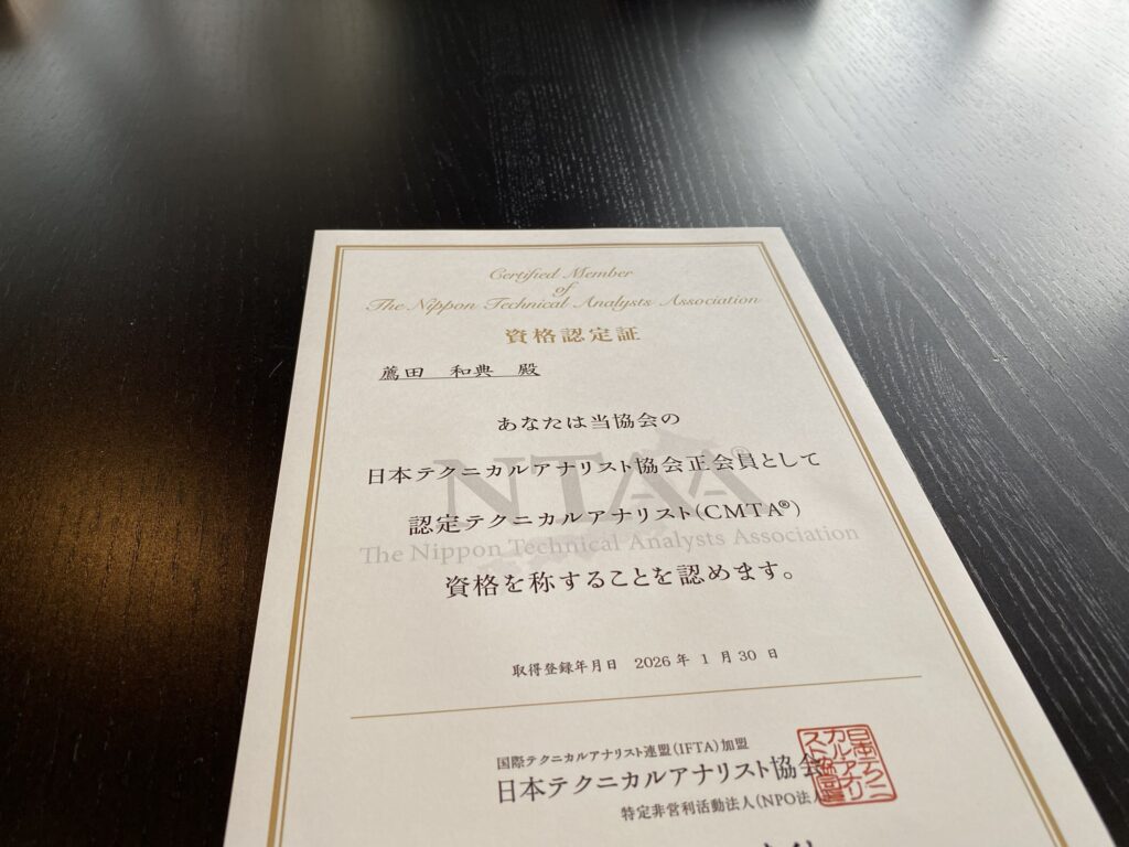 “日本テクニカルアナリスト協会 認定テクニカルアナリスト(CMTA®)”となり、資格認定証が届きました。